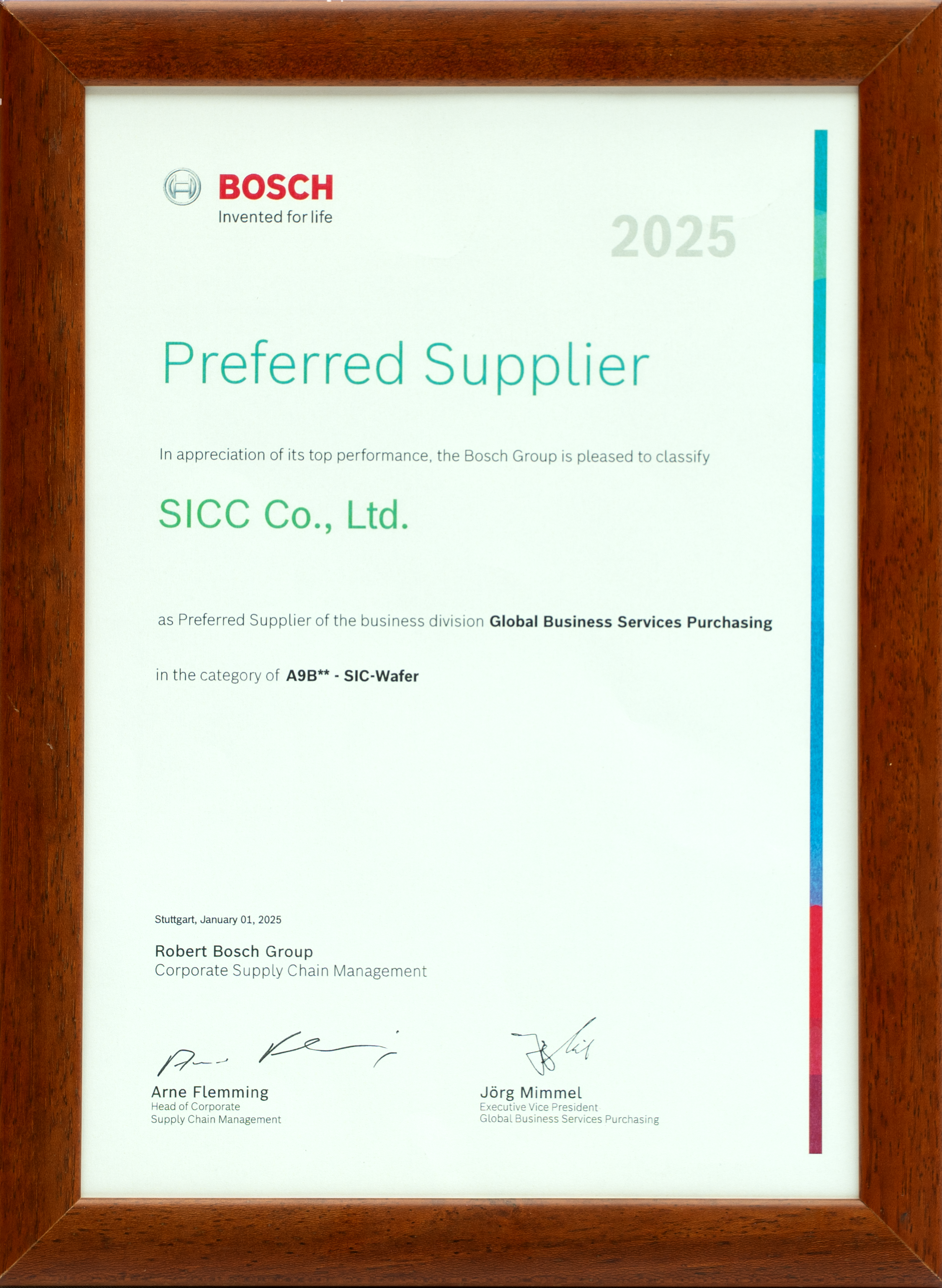 SICC has long been committed to transforming its technological strength into product competitiveness. Since beginning its supplier relationship with Bosch, the company has successively received multiple honors, including an "Bosch Global Supplier Award" and the status "Preferred Supplier." As leading global supplier of technology and services, Bosch Group's standards continually drive us to surpass ourselves. Receiving the "Preferred Supplier " status is not only an affirmation of our past efforts but also a motivation for the future. SICC will continue to be guided by technological leadership, deepen collaborative innovation with strategic partners, and jointly address the challenges and opportunities brought by the new energy revolution.