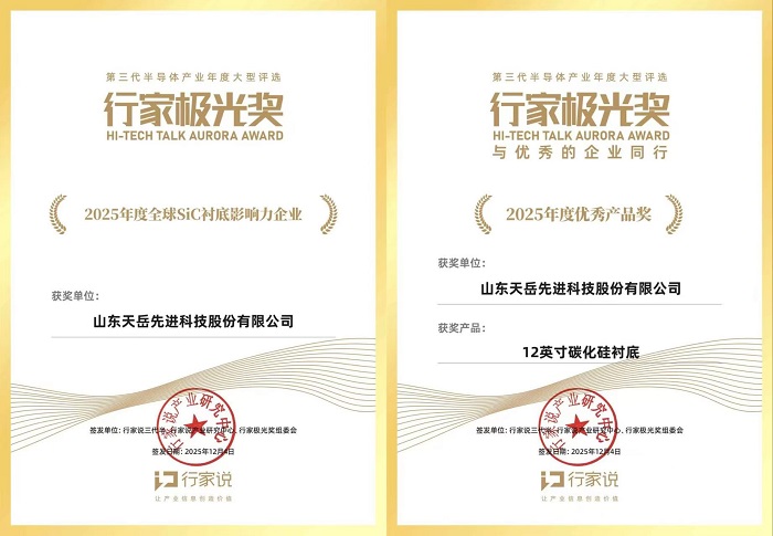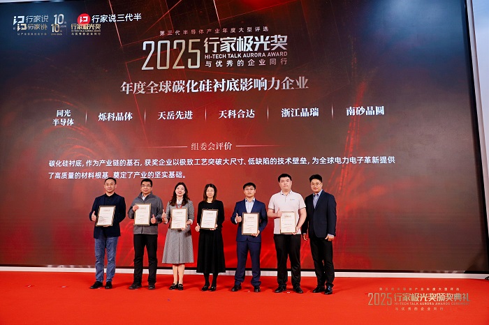 12月4日晚,由行家说主办的“2025行家极光奖”颁奖典礼在深圳隆重召开。行家极光奖在业内久负盛名,从产业纵深角度、专业严谨地评选出获奖单位及产品,其评选结果一直被誉为第三代半导体产业的“风向标”。天岳先进凭借在衬底技术突破与量产应用上的显著成果,荣获“全球SIC衬底影响力企业”和“2025年度优秀产品奖”。