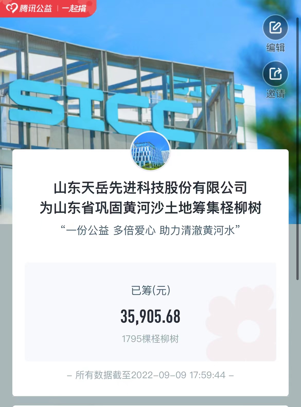此次99公益日,天岳先进发起的一起捐,在济南总部、济宁厂区带动捐赠人次近300人次,共筹得善款40408.4元,其中用户捐款35698元,腾讯公益平台配捐4710.4元,合计1795棵柽柳树。